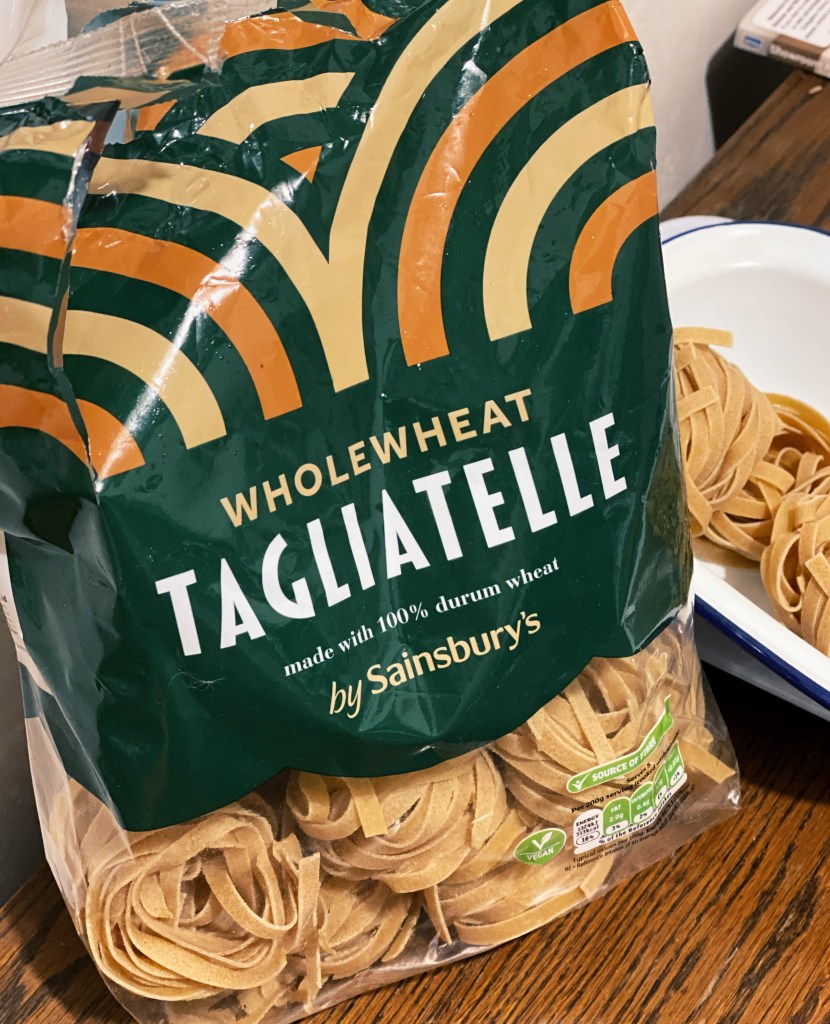 It took a while to get used to the different texture and to accept that (I think) standard pasta looks better in photos. But I’ve finally switched to wholewheat pasta. According to Sainsbury’s, it’s got ‘all the goodness of the wholegrain and at least twice the fibre of standard pasta. It’s got all the right words in the description, must be healthy!