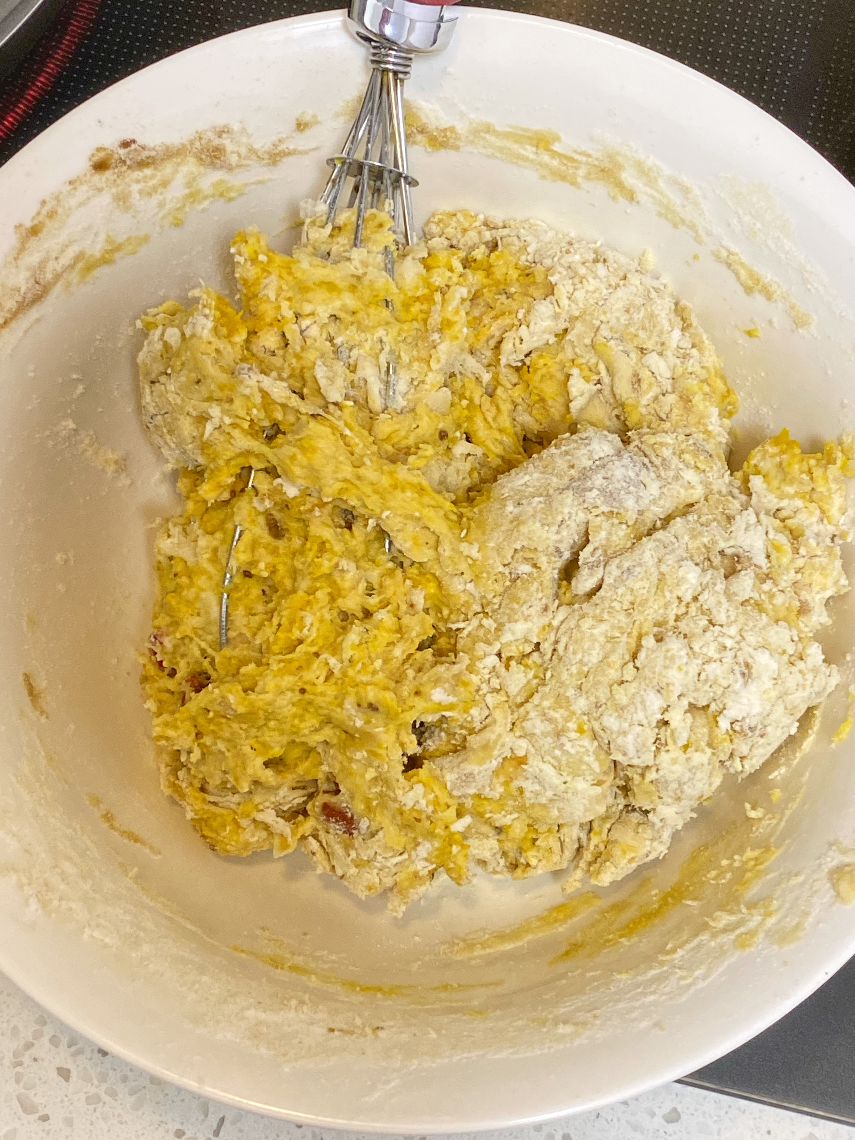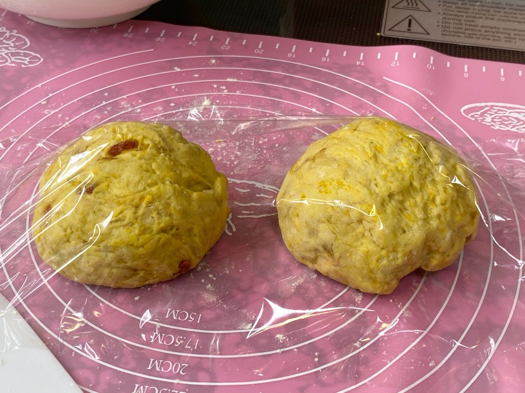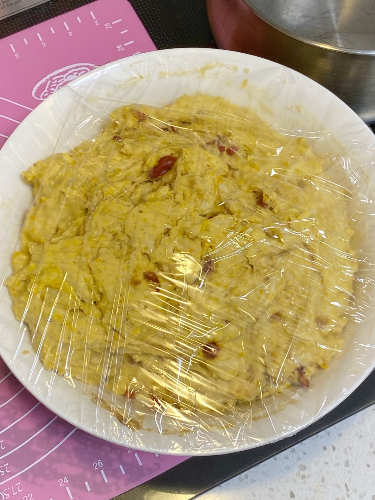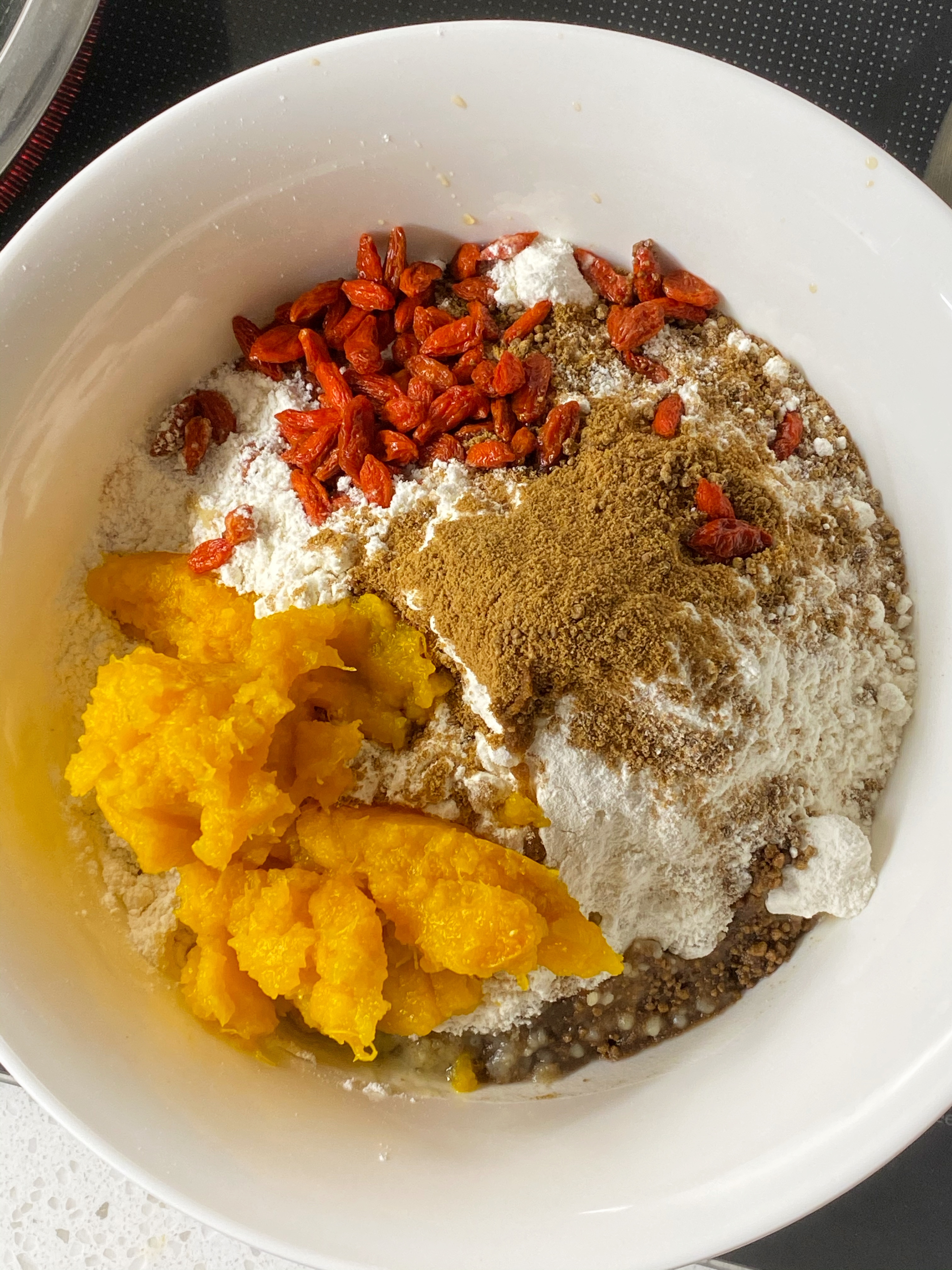 Put the flour, salt, sugar, oil, mashed pumpkin, goji berries and the yeast water into a large bowl. Mix it all up until you can’t see any flour.