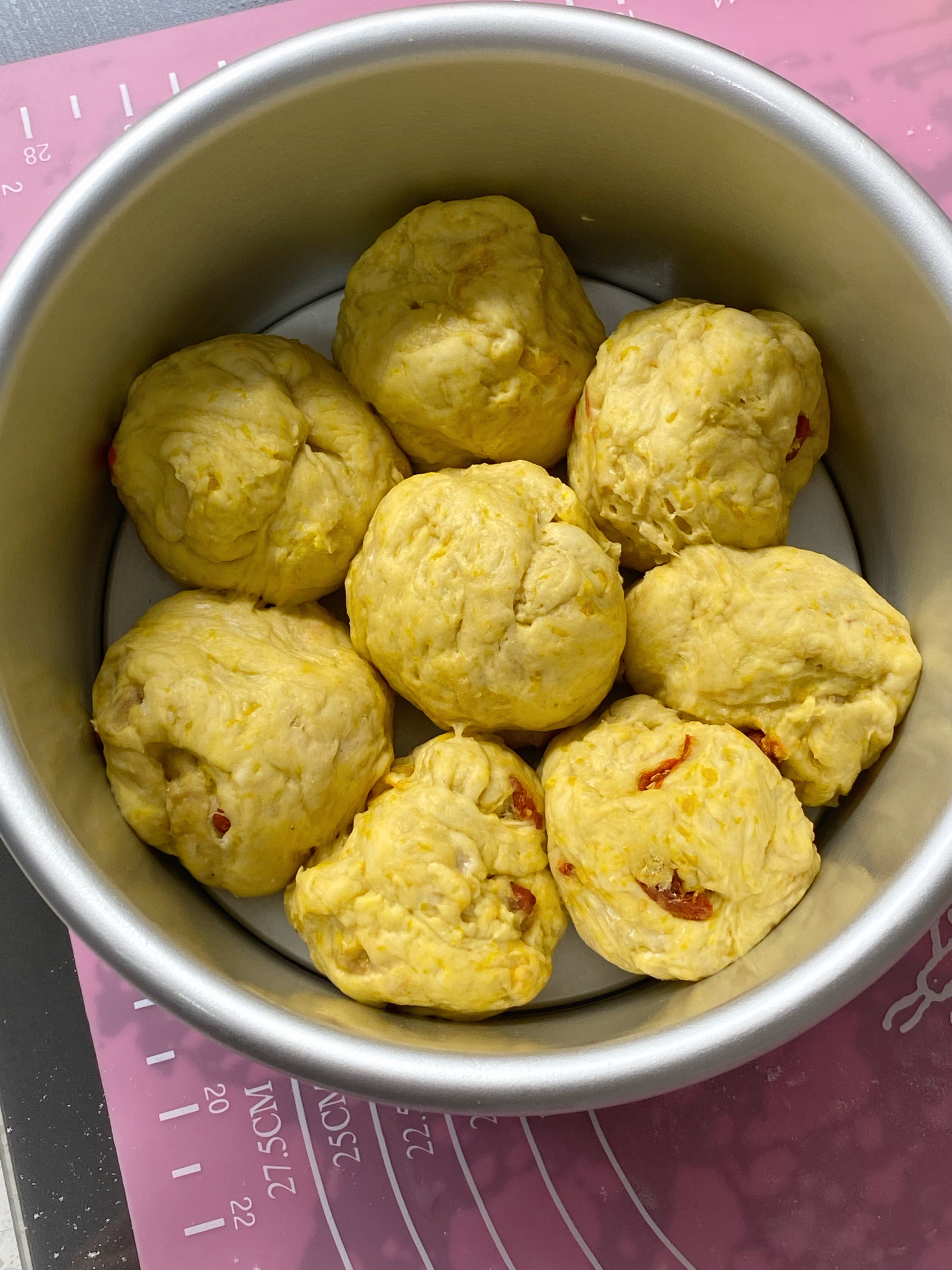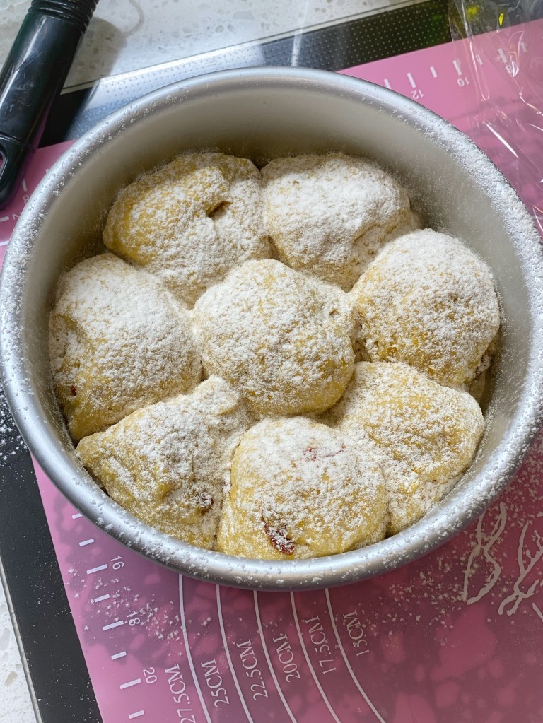 Arrange them in a circle in a greased 6-inch cake tin. Leave to rise in a warm place for 50 minutes.