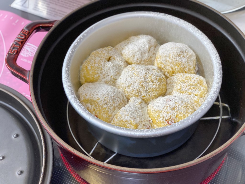 To make these rolls, put the dough in a cake tin, then put it in a Dutch oven and bake on low heat. The only small difference in the rolls is that they won’t have a beautiful golden-brown surface, other than that they taste just like oven rolls.