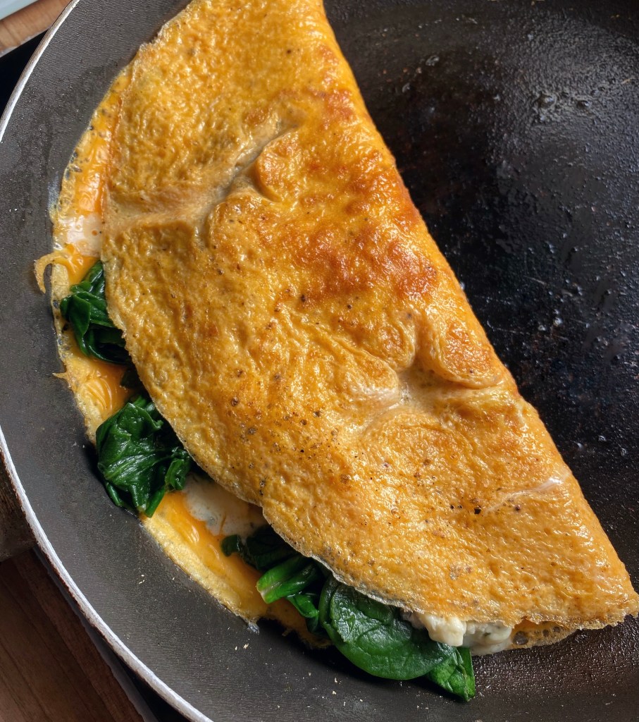 - Leave for 20 seconds, then add the cooked spinach over half the omelette. Add the crumbled blue cheese on top.