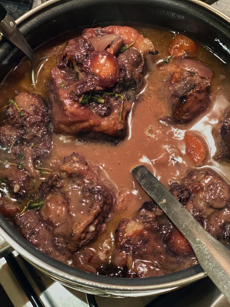 - After 3 hours, the meat should be very tender (but not falling apart) and the sauce should be thick. If the sauce isn’t thick enough, transfer the oxtail pieces to a plate and keep warm while you add a tiny bit of flour+water mixture to thicken the sauce on medium or high heat. Once the sauce has thickened to your desired consistency, turn down the heat, return the oxtail pieces, cover with a lid, cook for a few minutes, and then serve with creamy mashed potato.