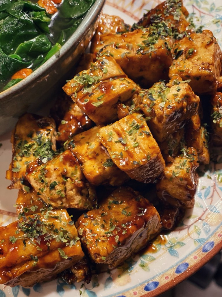 - Add tofu back in the pan and stir to coat evenly with the sauce. Serve and garnish with a sprinkle of Japanese seaweed, chopped spring onion or sesame seeds.