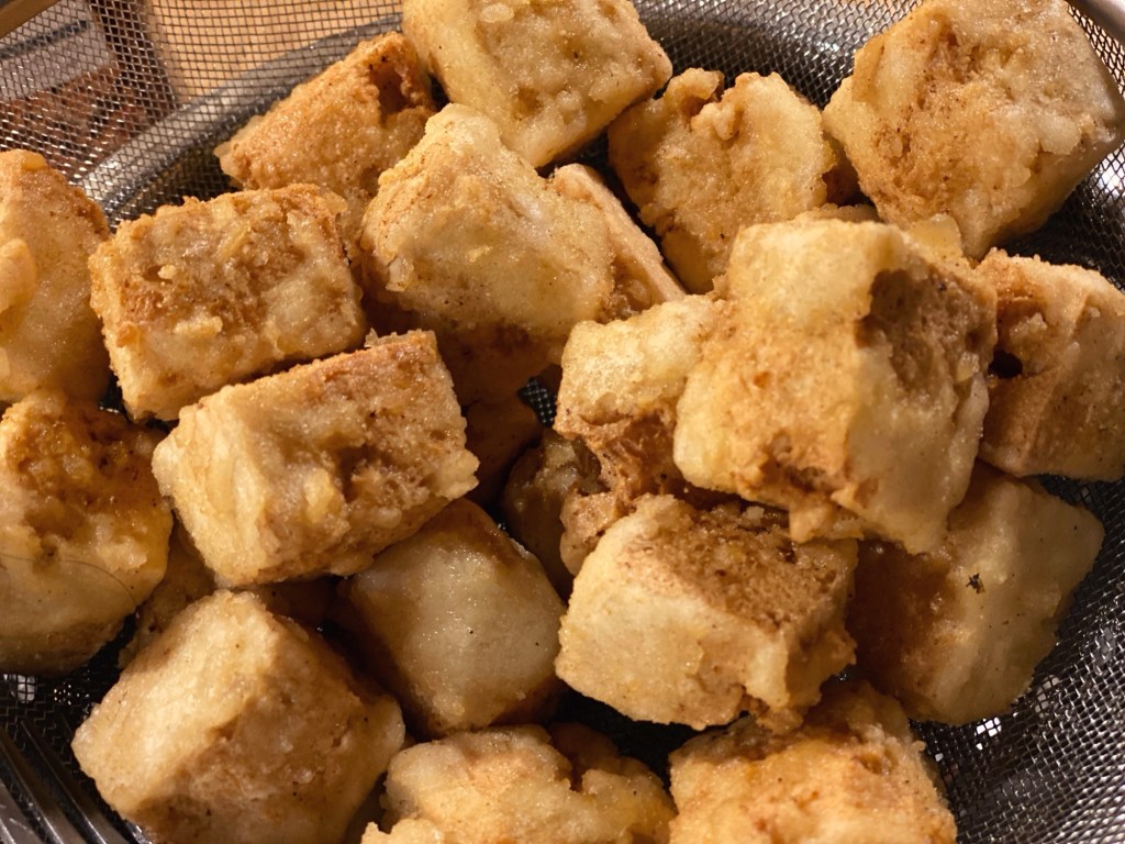 - Turn up the heat slightly and deep fry tofu again for 1-2 mins until golden. Remove from oil and set aside.