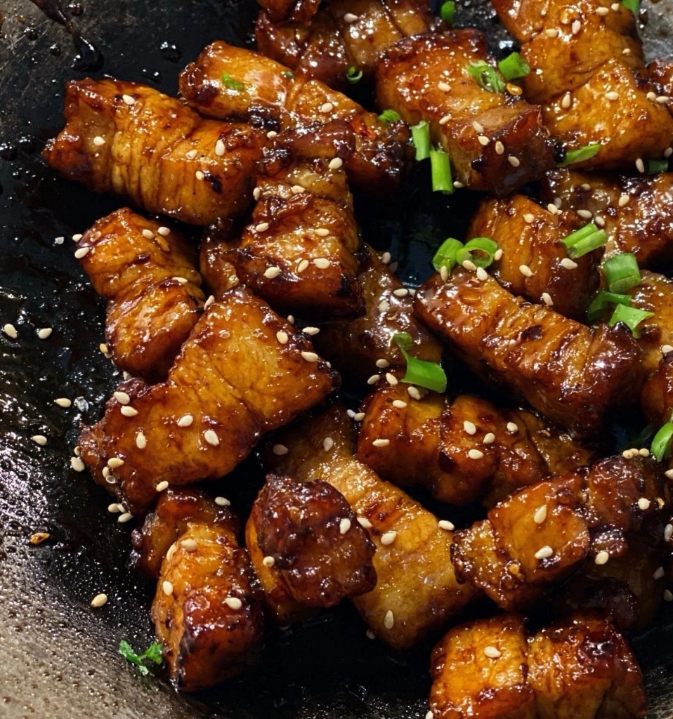 - Return pork belly to wok and toss them quickly so they are evenly coated in the glaze and the glaze is thickened. It should be sticky and glossy.
