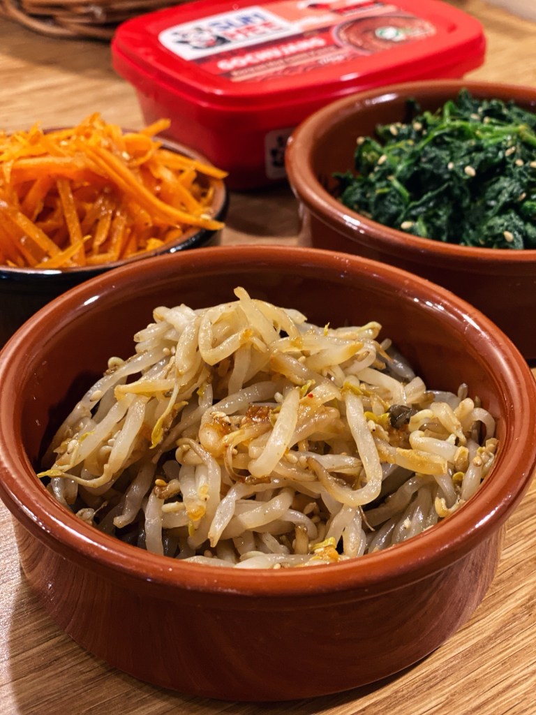 - Add the seasoning mixture to the spinach and beansprouts separately and mix well. Taste to see if you need any more additional seasoning.