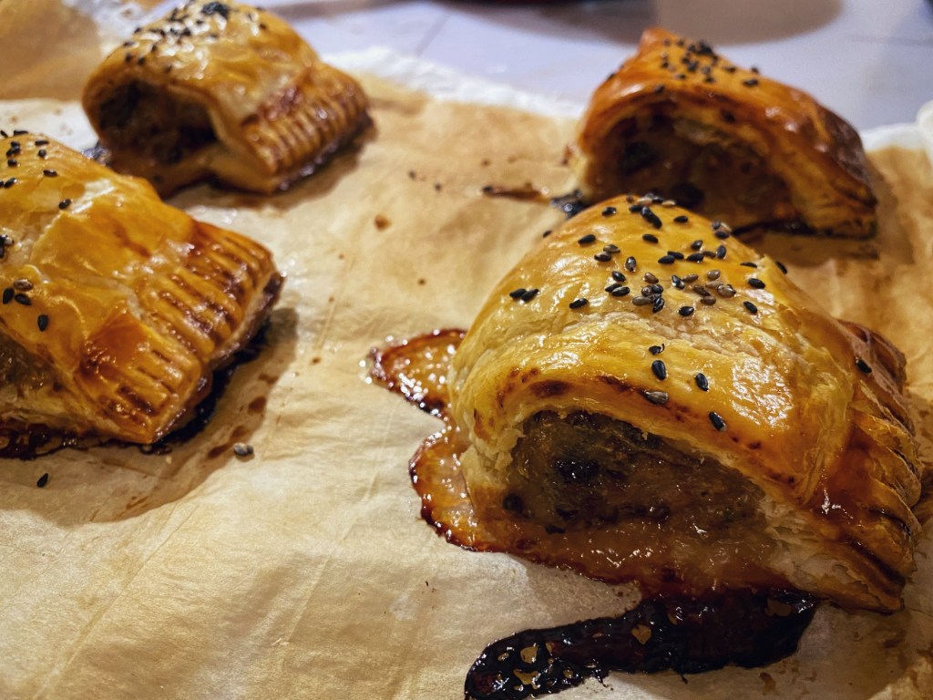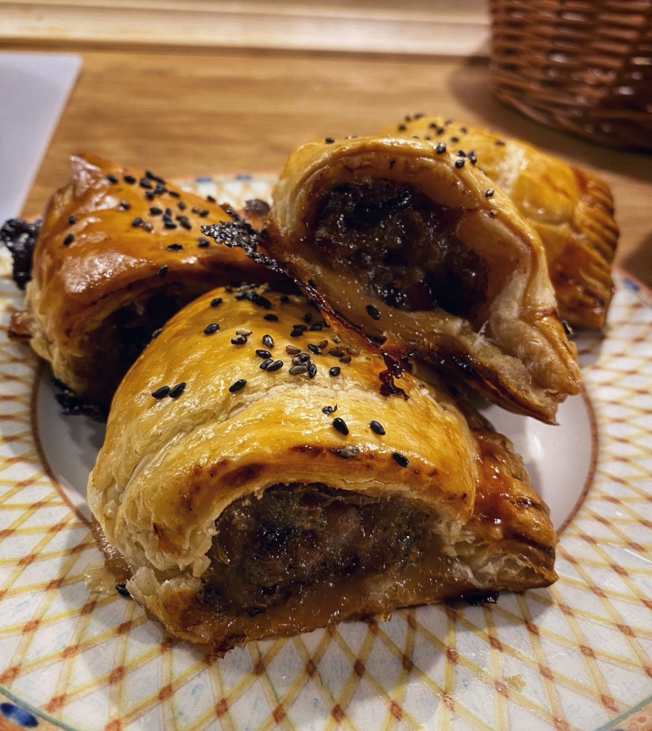 - Cut into 4 sausage rolls and place on a lined baking sheet. Brush the sausage rolls with egg wash and sprinkle with black sesame (if using).